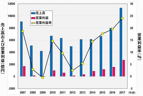 日本最大の半導体製造装置メーカーである東京エレクトロン(TEL)の業績が好調の模様である。2015年以降、売上高も営業利益も増大し、2017年度は(予測値ではあるが)、会社設立以来初めて1兆円を超え(1兆1300憶円)、営業利益率も24%に達した(図1)。