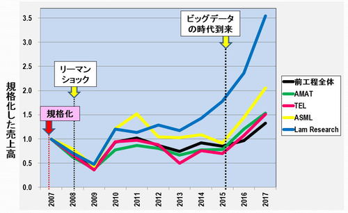 図3 2007年で規格化したトップ4の売上高比較出所:2013年までは電子ジャーナル『半導体製造装置データブック』、2014年以降は各社のIRデータ