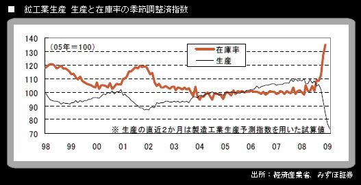 高炉大手が前年比4割減産を表明している鉄鋼業についても、同じようなことが言える。12月の生産は前年同月比▲3割弱。自動車など他産業の生産落ち込みからの波及を考えると、鉄鋼業についても、なお大幅な減産が行われていく公算が大きい。