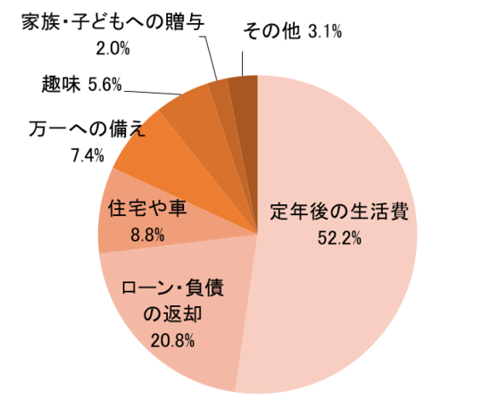 退職金を受け取った60~65歳の8630人を対象に、フィデリティ退職・投資教育研究所がおこなったウェブアンケート調査があります(*3)。それによると、退職金の使用目的として最も多かったのが「定年後の生活費」(52.2%)。次いで「ローン・負債の返済」(20.8%)、「住宅や車」(8.8%)、「万一の備え」(7.4%)、「趣味」(5.6%)、「その他」(3.1%)、「家族・子どもへの贈与」(2.0%)となっています。