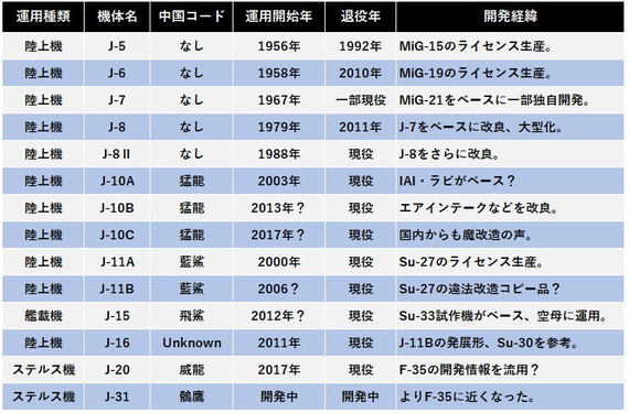 ライセンス生産が中止されたことで、中国の戦闘機はここから一旦、独自開発の道を歩みます。まず残されたMiG-21の部品をもとに「J-7」を完成させると、これを発展させた「J-8」「J-8Ⅱ」を開発し、冷戦終了頃まで主力戦闘機として運用していました(下の図と表)。
