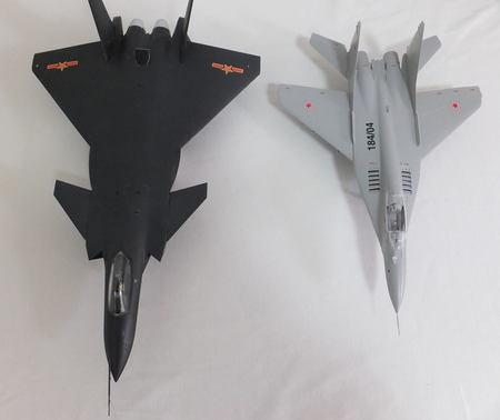 左が「J-20」。右が「MiG-29」。いずれも1/72プラモデル(Mig-29はタミヤ製)。J-20の機体の大きさがよく分かる