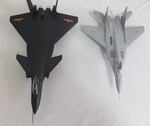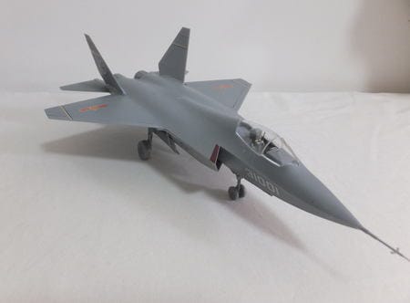 J-31は、現在自衛隊でも導入が進められているアメリカ空軍の「F-35」に近い形状になっています。というよりも、J-31のプラモデルを作ってみると、そのまま金型をF-35にも流用できるのではと思うくらい酷似しています(下の写真)。型式番号が20番台から30番台に一気に飛んだのも、わざわざ数字を合わせてきたのかもしれません(意味があるとは思えませんが)。