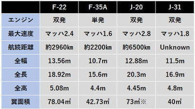 米中ステルス機の主要諸元比較(航空自衛隊サイト、百度百科等を参照して作成、カナード面積は含まず)