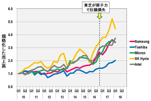 各NANDメーカーの2010年第1四半期の売上高を「1」と規格化して、その後の成長率をグラフにしてみた(図4)。このグラフから、東芝メモリの本質的な問題点を指摘することができる。