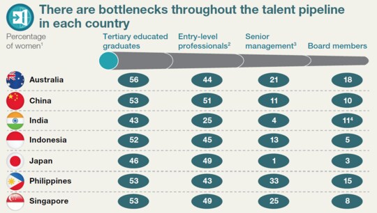 オーストラリア・中国・インド・インドネシア・フィリピン・シンガポールに日本を加えた7カ国についてまとめた同レポートによると、日本の経営幹部層の女性比率は1%、役員でも全体の3%のみである。7カ国の中でも飛びぬけて低い状況だ。そしてその7カ国も、リーダーシップの中での女性比率は13%(2016年、なお2011年には6%)と西洋諸国平均の28%にはいまだ程遠い。