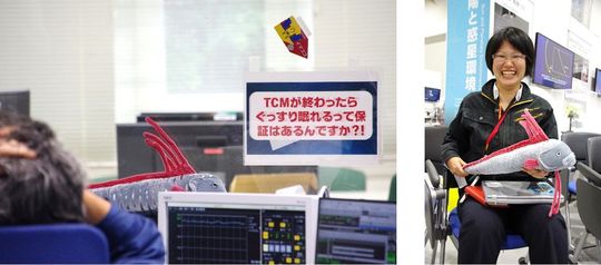 (左)管制室にあった張り紙。張り紙の横には、リュウグウノツカイのぬいぐるみが。(右)記者会見場にも! JAXA広報の矢部氏と。沼津港深海水族館で買ったそう。
