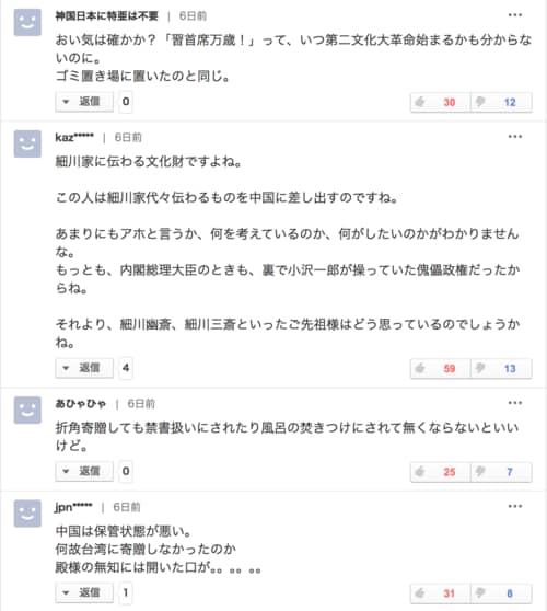 だが、肥後細川藩54万石の名家に伝わる漢籍の寄贈について、ネット上では「保守派」の人たちを中心に反発の声も上がっている。いわく、これは文化財流出ではないのか、先祖から伝わった宝物を勝手に手放すな、媚中外交は許すまじ云々・・・、というわけだ。一部の保守系言論人からも、ツイッター上などで疑義を呈する声が上がっている。