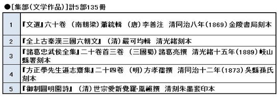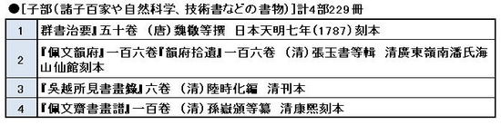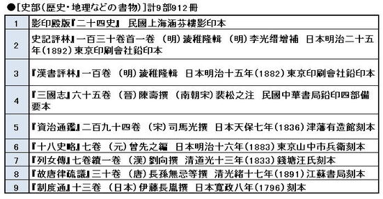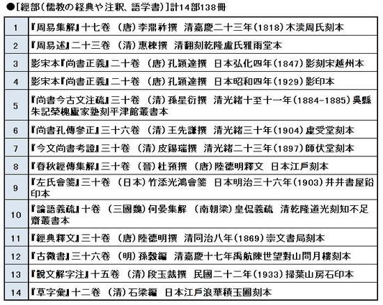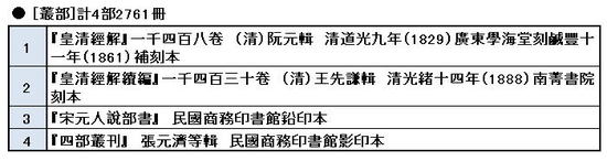 また、中国の大手ニュースポータルサイト・新浪の文化コンテンツである『新浪文化』には、寄贈された漢籍の具体的な目録および提要が記されている。以下の表に挙げておこう。よくわからない方はざっと読み飛ばしていただいても構わない。