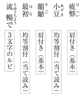 一般にルビは中付きが多いようですが、京極ルールでは基本的に肩付き(漢字のアタマ揃え)を採用しました。なぜかというと、その漢字の本来の読み方ではない、当て読みと差別化するためですね(図1)。小豆は「小」で「あ」、「豆」で「ずき」とは読みませんよね。こういう場合は2文字の漢字に対して「あずき」を均等に振る。しかし、3文字の漢字に3文字の当て読みのルビが付くときは、中付きだと漢字1文字に1文字のルビが付くわけで、通常の場合と区別がつかなくなっちゃいます。