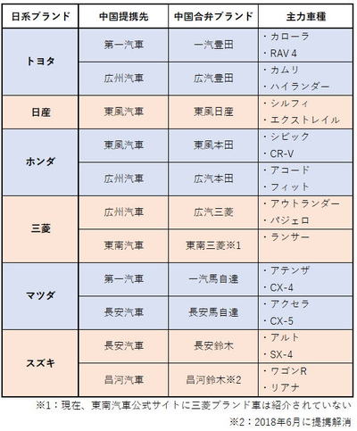 日系乗用車ブランドから見た中国メーカーとの提携関係