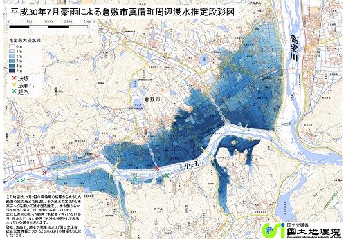 下の図は、今回の水害で大きな被害の出た岡山県倉敷市真備町の浸水推定図である(国土地理院)。その範囲は、倉敷市のつくったハザードマップで「想定浸水域」とされた地域とほぼ一致している。