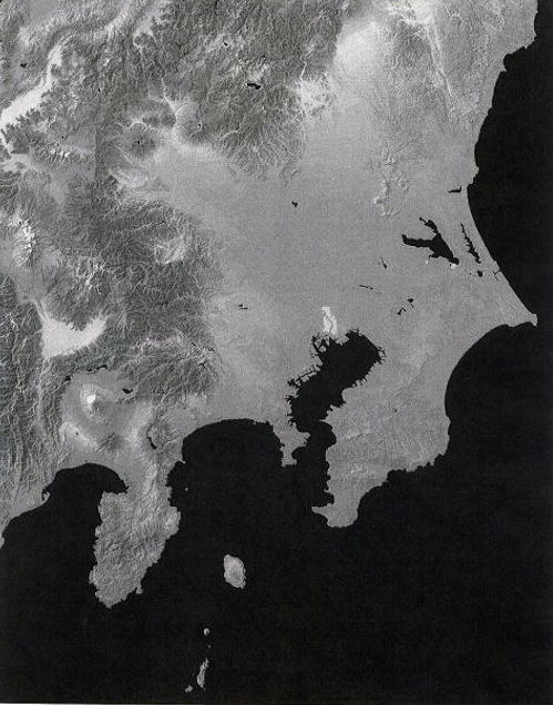 図2は図1の海面をコンピューターで5m上昇させて作成したもので、6000年前の縄文前期の関東地方の地形を表している。東京湾の海水は関東の奥深く、栃木県と群馬県の県境の渡良瀬遊水池の近くまで達していた。