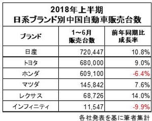2018年上半期の日系自動車ブランドの販売台数のみをまとめたのが下の表です。メーカー別販売台数同様に日系としては日産がシェアトップで、2桁成長を遂げるなど躍進しています。