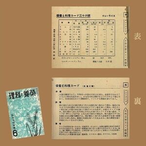 1938(昭和13)年6月号の「栄養と料理カード」。「メリケン粉」は小麦粉のこと。戦前の計量スプーンは統一されておらず、このカードでは「D.S.=デザートスプーン14cc」「t.s.=ティースプーン7cc」を使用。肉は牛肉だが、1人分40gを一口大に切ったら2個ほど。じゃが芋もにんじんも入らないカレー。5人分で、カレーソースたっぷりの中に肉が10個ぐらいという仕上がりと