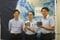 衛星RSP-00(中央)を手にするリーマンサット・プロジェクトのメンバー。左からファウンダーの大谷和敬さん。RSP-00プロジェクトマネジャーの嶋村圭史さん。プロジェクトの母体、一般社団法人リーマンサットスペーシズ代表理事の宮本卓さん。