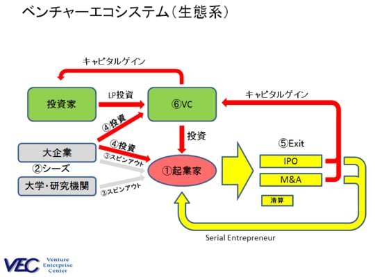 ベンチャーエコシステムは、イノベーションエコシステムとも言われるが、森の生物の生態系になぞらえて、だいたい次の図のようなものが念頭に置かれている。図の中のそれぞれの要素について見ていこう。
