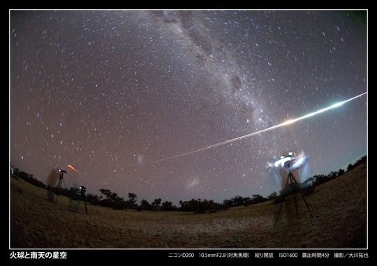 さらに4年後の2010年6月13日、はやぶさ1号は地球に到達しました。オーストラリア上空に試料容器を投下すると、全ての任務を終えた機体は大気に突入して燃え尽きました。その最後の姿はまばゆい流星として見えました。大川拓也さんの撮影した、はやぶさ1号の最期の姿を示します。(入念な準備と計算の必要な写真です。)