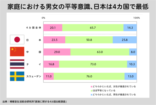 日本では「平等」50.8%、「女性が優遇」23.5%、「男性が優遇」25.8%。