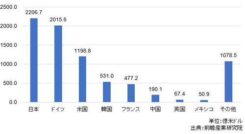 中国系シンクタンクの前瞻産業研究院も、2017年通年(2017年1~12月)における自動車部品メーカートップ100をまとめています。下のグラフは、ランクインした企業の国別売上高をまとめたものです。
