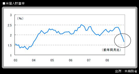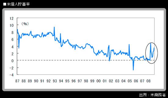 12月の米個人消費は、前月比▲1.0%。過去最長を更新する6カ月連続の減少となった。実質ベースでは同▲0.5%で2カ月ぶりの減少。また、2008年通年では前年比+3.6%にとどまり、1961年以来47年ぶりの低い伸び。個人可処分所得は前月比▲0.2%。個人(家計)貯蓄率は3.6%で、前月の2.8%から上昇したものの、過剰消費が強まり始めた92年よりも前に推移していた8%前後の水準は、まだ遠い。