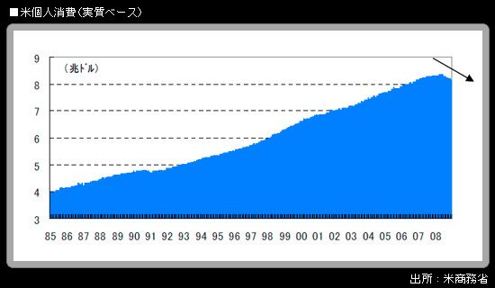 (1)米国の人口は、92年1月時点で2億5533万人、2008年12月時点で3億585万人、この17年間の増加率は約20%である。92年1月時点の実質個人消費(年率換算)を1.2倍すると、5兆8454億ドル。2008年12月実績である8兆1675億ドルとの差額は▲2兆3221億ドルという、非常に大きな数字となる。米国の実質GDP(国内総生産)は約11兆6000億ドルなので、その約20%が今後失われるという話になる。