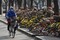 中国・北京で、道路脇に放置されたシェア自転車のそばを通る女性(2018年2月21日撮影)。(c)AFP PHOTO / GREG BAKER〔AFPBB News〕