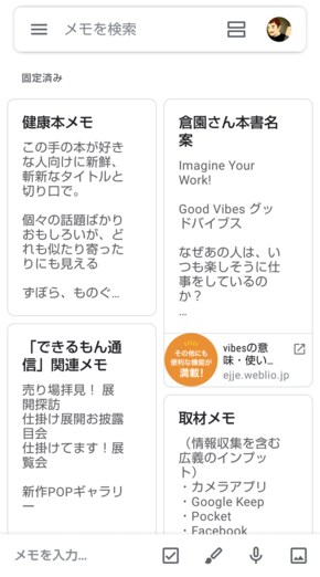 藤井氏が実際に使っている「Google Keep」画面のスクリーンショット