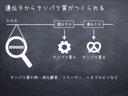 遺伝子は「DNA」という物質からできている。遺伝子にある情報をもとにしてタンパク質が作られ、そのタンパク質が体内でさまざまなはたらきをする。異なる遺伝子からは、異なるタンパク質が作られる。