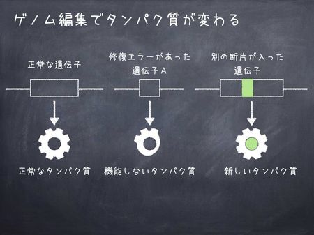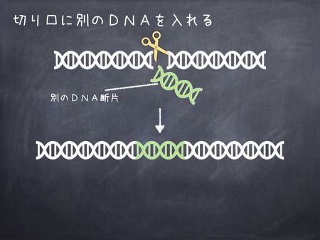 ゲノム編集ができるのは、機能をなくすだけではない。修復するとき、あらかじめ別のDNAの断片を入れておくことで、その断片を「組み込む」こともできる。