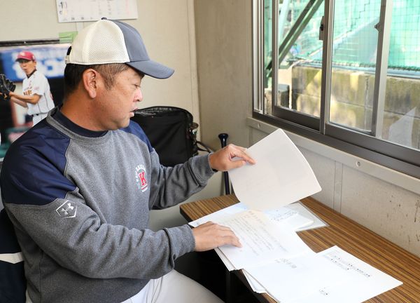 大久保秀昭(おおくぼひであき)監督。同大OBで近鉄バファローズなどで捕手としてプレー。エネオス野球部監督として多くのプロ選手を育てる。(撮影:花井智子)