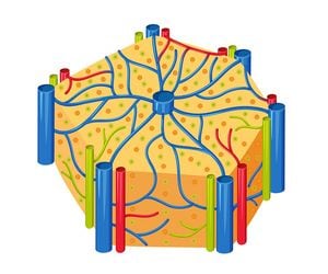 肝小葉の模式図。この六角柱の構造が肝臓の機能的最小単位。赤い管は動脈、六角形の角にある青い管は門脈、六角形中心部の青い管は中心静脈、緑の管は胆管を表す。肝臓から出てゆく管は中心静脈と胆管。