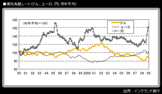 ドル、ユーロ、円の主要3通貨のうちで最も強い通貨は何か。現在のところ、答えは「円」ということになる。政策金利が最も低い年0.1%で、しかも人口減少・少子高齢化ゆえに内需の力が趨勢として弱く、財政事情は米欧よりも悪い。それでも市場で円が買われてきた理由として、「信用バブル」崩壊で金融システムが負った傷の深さが米欧よりも相対的に浅いから「逃避通貨」として買われているのだ、という説明がなされていたこともあった。だが、1月に開催された金融政策決定会合終了後の発表文で、「金融環境が厳しさを増す場合には、金融面から実体経済への下押し圧力が高まり、金融と実体経済の負の相乗作用が強まる可能性がある」というリスク要因に日銀は言及するに至っており、そうした説明はもはやあてはまりにくくなっている。