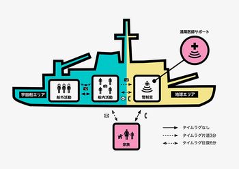 船内を地球エリアと宇宙エリアに区切り、6分間のタイムラグ設けて毎日交信を行う。宇宙エリアはさらに船内と船外(宇宙空間)に分かれ、船内から宇宙空間に出て船外活動(EVA)を行う際は、宇宙服も身に着ける。本格的である。