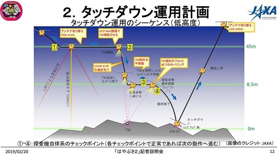 はやぶさ2は、いくつかの段階で「GO/NoGO判断」を行う。チームが「最も大きい判断」と位置付けるのは22日朝6時2分に到達予定の、高度500mの地点だ。