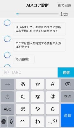 最初に迎え入れてくれたのはチャット画面。AIスコア診断のチャットボットがユーザーに話しかけてくる。最初にニックネームを決めたら、生まれた年月や性別、最終学歴、あとは現在勤める会社のことや家族構成を回答していく。設問の多くは選択式で、全部で18問程度ある。