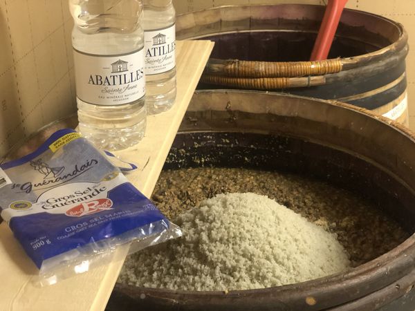 湯浅醤油がフランスでつくる醤油の原材料。麹菌以外、現地調達した。「ゲランドの塩」とフランス産軟水のミネラルウォーターが見えている欧州ミシュランシェフたちに“世界一”と絶賛される日本の醤油職人を、以前、本コラムでご紹介した。醤油発祥の地・和歌山県有田郡湯浅町(人口約1万1500人)で1881年に創業した調味料製造会社「丸新本家」の5代目当主・新古敏朗氏(49)だ。