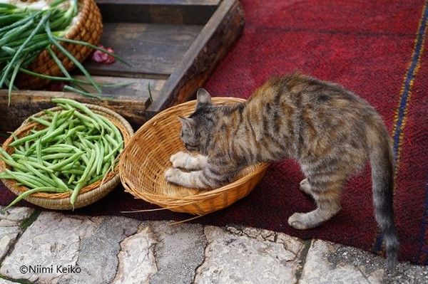 私が2回目に訪問したとき、ちょうどハリウッド映画のロケを行っていました。いつも遊んでいる広場に、突如として市場のセットが出現したので、猫たちは「一体全体、どうしちゃったの??」