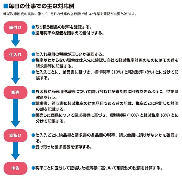 店舗では、軽減税率制度の実施に伴って、毎日の仕事の各段階で新しい作業や確認が必要となる。中小企業庁が配布している「軽減税率まるわかりBOOK」では、以下のようにまとめられている。