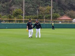 打撃投手を終えた石井に声を掛ける栗山監督。