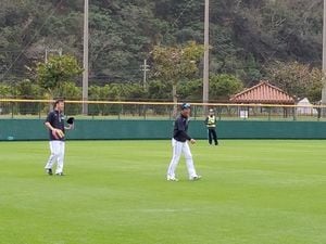 遠くから、栗山監督は選手たちを見ている。
