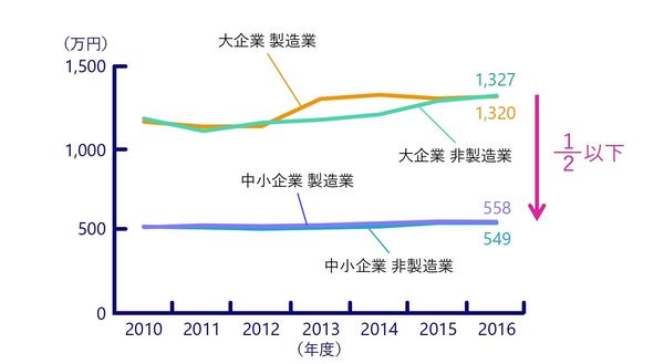 中小企業の労働生産性は、製造業・非製造業ともに大企業の半分以下といわれる。