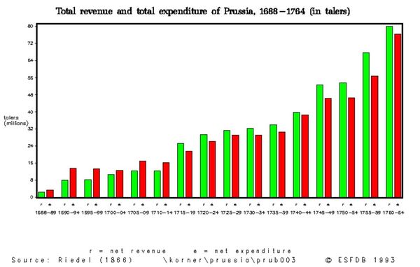 【表1】 プロイセンの総収入と総支出 1688〜1764年(単位:ターレル)(r=歳入、e=歳出)