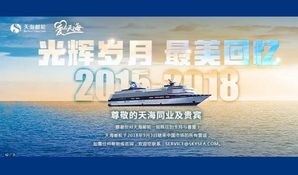 クルーズ船「天海新世紀」を運航していたクルーズ会社、スカイシークルーズのウェブサイト。2018年9月3日に中国市場のすべての運航を終了した、と記されている