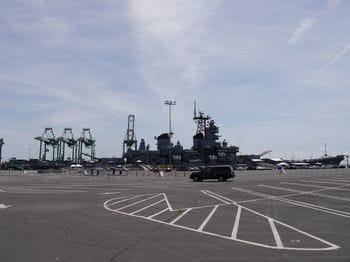 戦艦アイオワは装甲の重みで水中に沈んでいる部分が多く、クイーンメリーよりも低く見える。