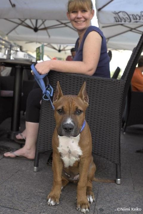 広場に机を出したオープンカフェでは、犬の散歩の途中で休憩する人もいます。