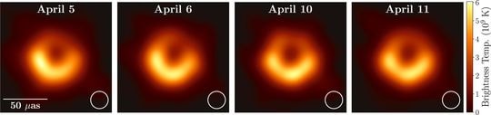 イベント・ホライズン・テレスコープによって撮像されたM87の超巨大ブラックホール近傍。2017/04/05、04/06、04/10、04/11(協定世界時)にわたって安定した構造が見られる。線分スケールは50マイクロ秒角(0.000000014°)、円は望遠鏡の角度分解能力(20マイクロ秒角)を表わす。 Image by the Event Horizon Telescope Collaboration[5] (CC BY 3.0)拡大画像表示