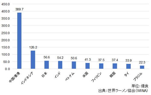 世界ラーメン協会(WINA)の世界の国・地域別即席麺需要データ(2017年)によると、中国(香港含む)の年間即席麺消費量は389.7億食。2位のインドネシア(126.2億食)の約3倍と堂々の1位につけています(下のグラフ)。