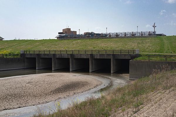 調圧水槽からポンプによって吸い上げられた水は、この排水口から江戸川に排水される。排水口は1つで地下鉄が楽々通れる広さだ。江戸川からの逆流を防ぐ機能もある。