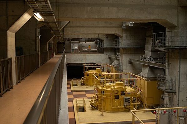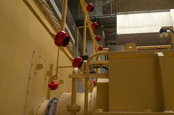 おしい。設備に水をかけてしまうとあとの復旧が大変だ。水ではなく二酸化炭素ガスを噴出する。火災が発生し、消火ボタンが押されると40秒後にポンプ設備全体が閉め切られ、密閉状態でガスが出る。もし見学時に火災が起こったら、逃げ遅れて閉じ込められないよう、十分気をつけてほしい。